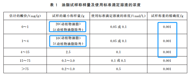 估计酸价在0~1mg/g和1~4mg/g时。试样的最小称样量做出了更详细的要求。此外,试样称重的精确度均为0.001g。