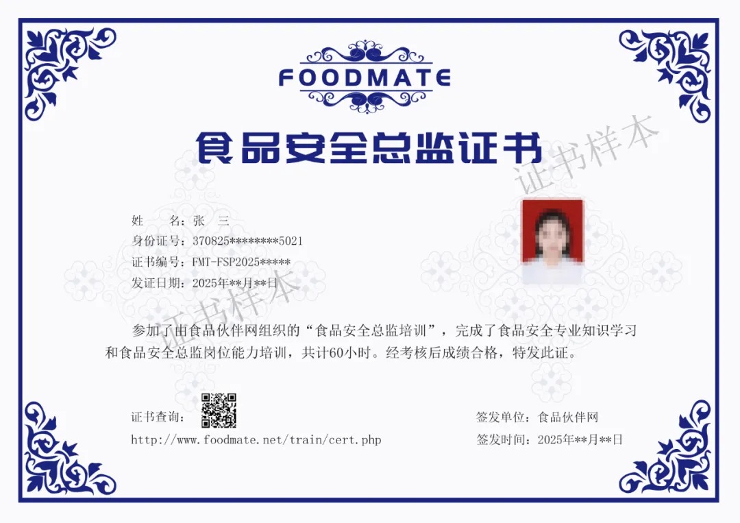 课程学习结束后,进行线上考试,成绩合格后可获得由食品伙伴网颁发的《食品安全总监证书》及《食品安全员证书》双证,证书可作为岗位晋升或食品安全知识相关培训学时证明。若成绩不合格,可免费补考。