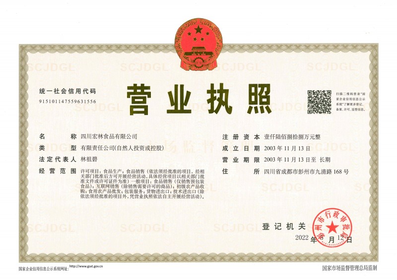 | 发证机构: | 彭州市市场监督管理局 | 发证时间 : | 2022-05-12 |