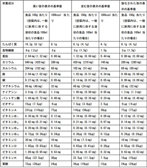 表2,营养成分强调声称基准值