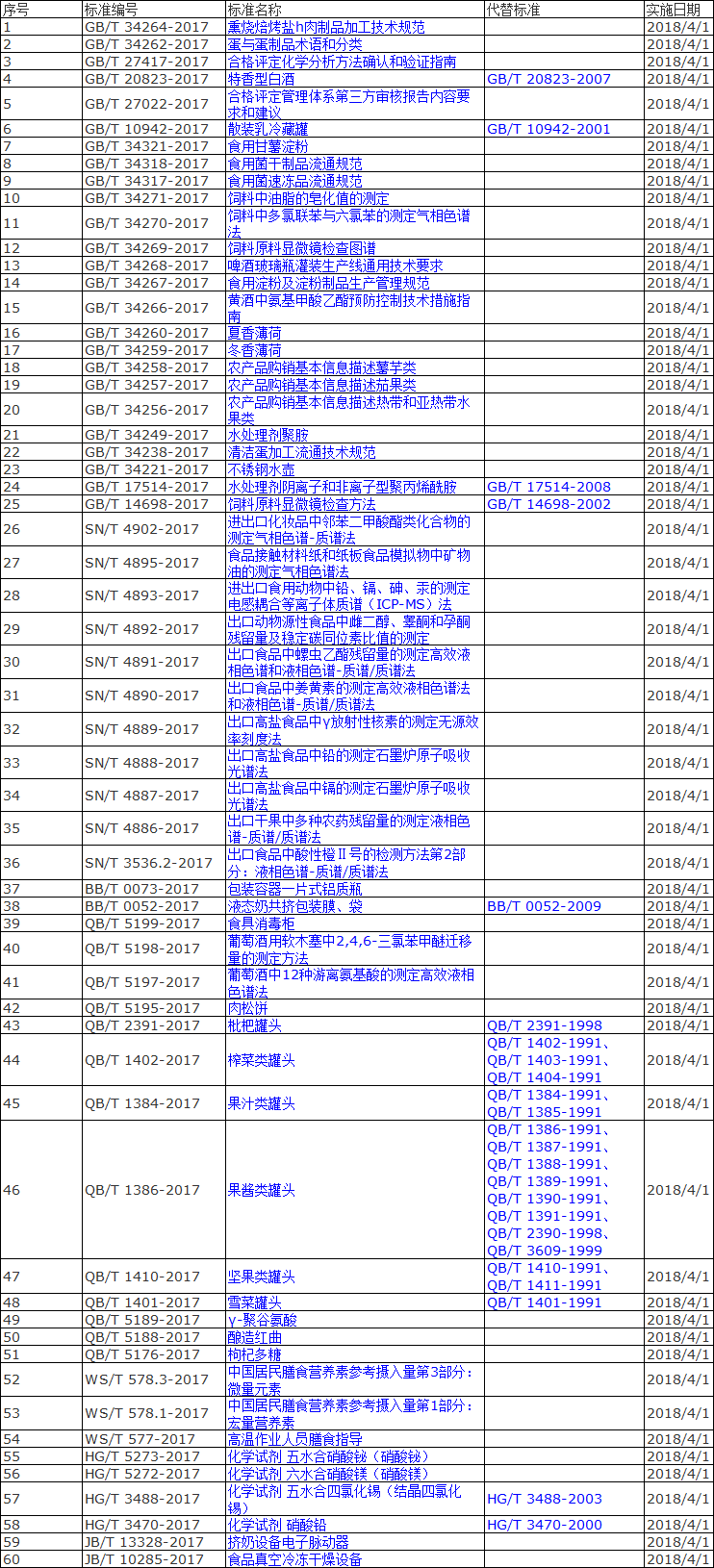 4月实施的60项食å“åŠé£Ÿå“ç›¸å…³æ ‡å‡†åç§°