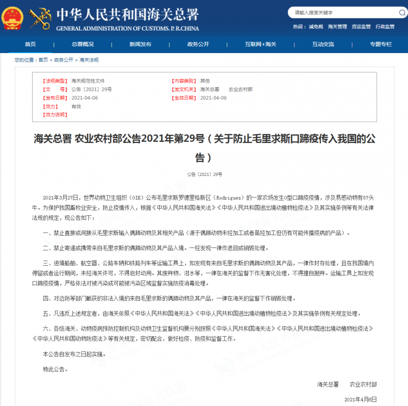 2021??日,为保护我国畜牧业安全,防止疫情传入,海关总署、农村农业部发布《关于防止毛里求斯口蹄疫传入我国的公告》(海关总署公告2021年第29号),禁止毛里求斯的偶蹄动物及其产品入境,自公告发布之日起实施、/div>
