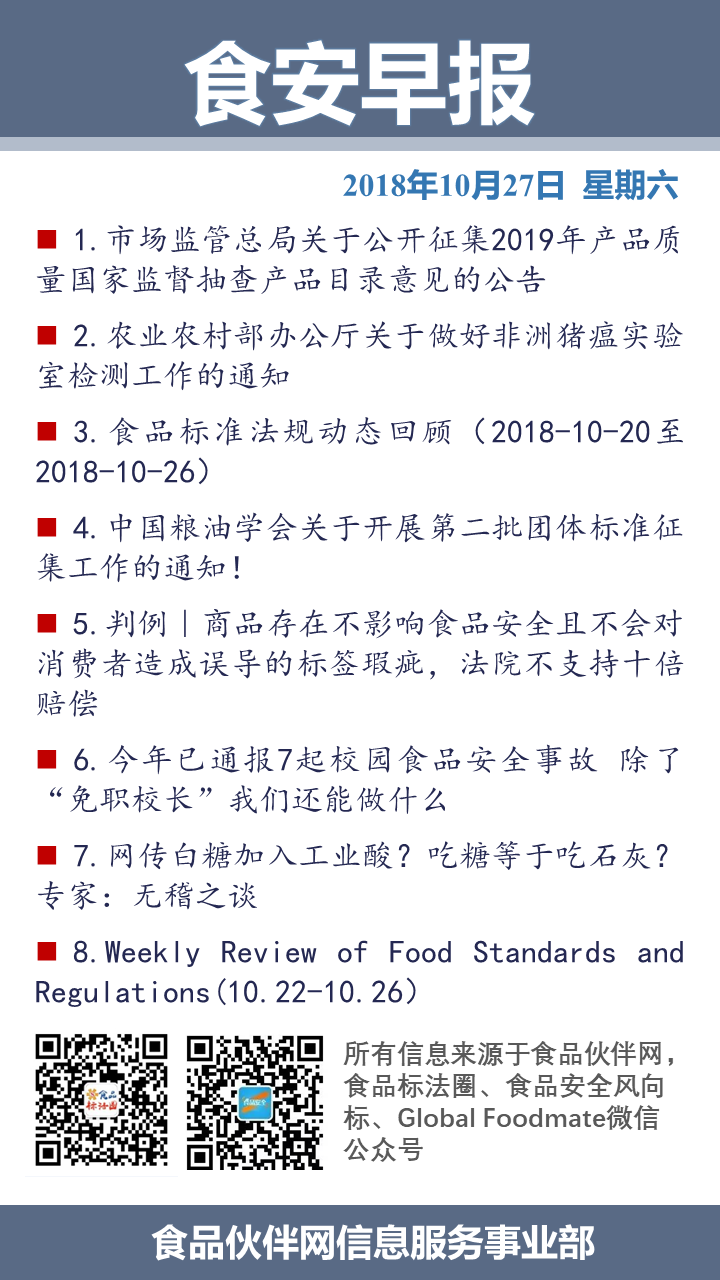 3.食品标准法规动态回顾(2018-10-20至2018-10-26)