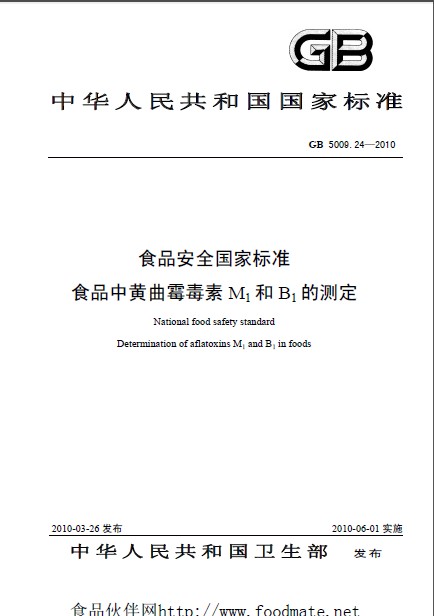 GB 5009.24-2010 食品中黄曲霉毒素M1和B1的测定 英文版 已有译文已打五折