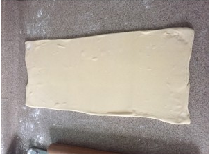 1. 将前4项配料混合揉成光滑的面团。盖保鲜膜室温松弛15~20分钟。面团松弛期间,将软化好的裹入黄油擀成18*15cm的薄片。