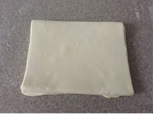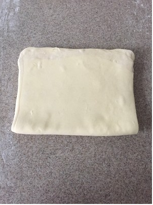 2. 将松弛好的面团擀成20*32cm的长方形面片。再将黄油放在面片中间,将面片上下两端往中间折起,两侧和中间接缝封紧。