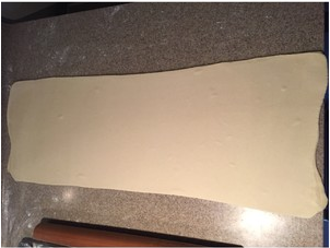 3. 折好的面片由中间往上下擀到20cm宽,将面片旋转90度,再由中间往上下擀到48~50cm。