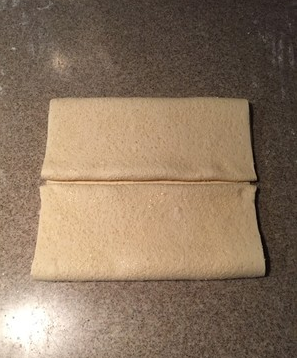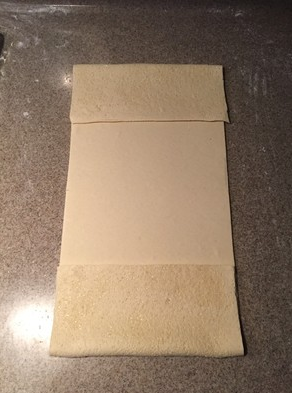 14. 最后再对折,中间用擀面杖轻压一下定型。包保鲜膜冷冻30分钟。