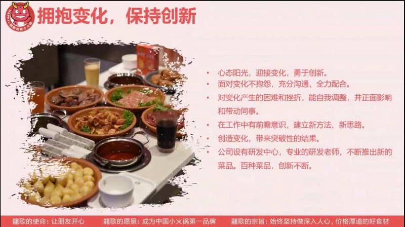 青岛鑫顺缘餐饮管理有限公司旗下品牌龙歌自助小火锅锁是一家集餐饮代理综合管理、品牌开发推广、餐饮人力资源拓展培训及餐饮管理咨询的专业型现代化企业。龙歌自助小火锅餐饮致力于 “百年品牌、现代餐饮”的潜心研究与开发推广,向市场提供具有个性化的“火锅.干锅”代理经营管理模式,结合重庆传统特色餐饮与现代化经营项目的推广服务。龙歌自助小火锅以独特的菜品主打产品、绿色健康的一次性植物油锅底、时尚典雅的装修风格、热情周到的服务,深深赢得广大顾客的一致好评,龙歌自助小火锅坚持诚信、健康的经营之路,倡导绿色、健康、时尚、环保的生活理念,迎合消费潮流建立一个形象良好且知名度高的连锁企业品牌形象。