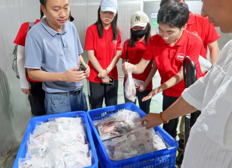 图为安徽省黄淮甲鱼良种繁育有限公司总经理陈万勇向老师及团队成员介绍加工流程