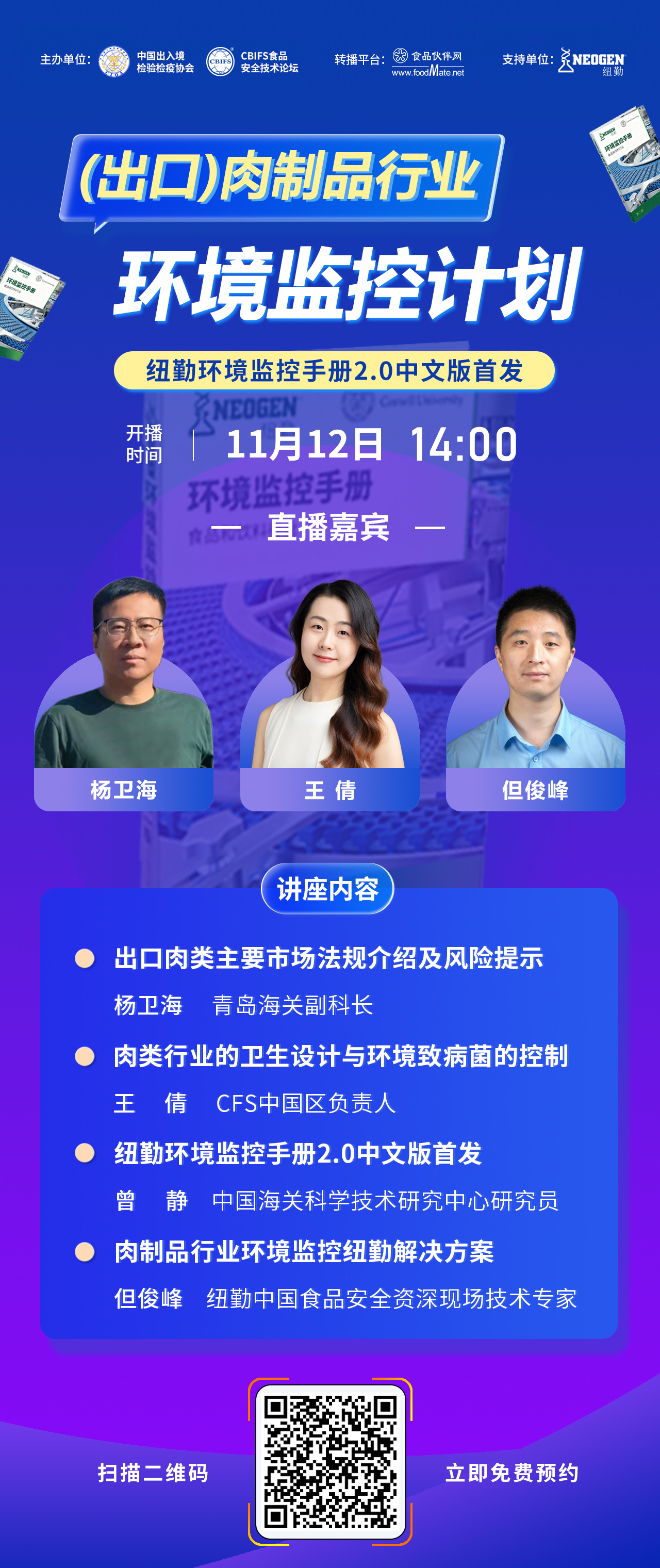 随着全球对食品安全要求的不断提高,特别是出口肉制品面临日益严格的国际法规和标准,生产企业的环境监控能力已成为核心竞争力之一。为助力肉制品出口企业深入理解国际法规要求,有效管控行业风险,我们诚挚地邀请您参加于11月12日举办的《(出口)肉制品行业环境监控计划》线上研讨会。本次会议将汇聚行业专家与海关权威人士,共同探讨环境监控的核心要点与前沿解决方案。