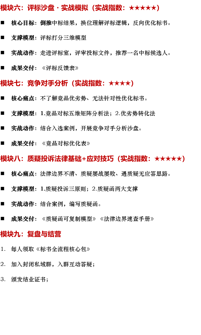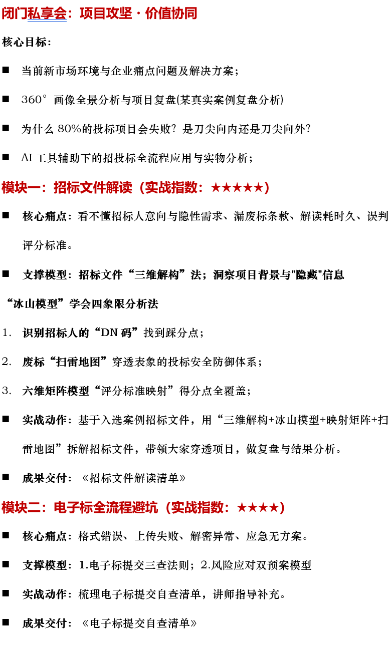 2.案例内容:需包含“招标文件(工程/服务/货物)+全流程任一环节痛点(如招标文件看不懂、技术标得分低、报价失分等各类问题)+对应投标文件(要求脱密处理)”,入选案例将植入课程,讲师现场指导。