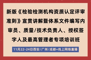 新版《检验检测机构资质认定评审准则》宣贯讲解暨体系文件编写内审员、质量/技术负责人、授权签字人及最高管理者专项培训班(西安/广州/成都+线上网络直播)