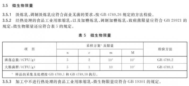 经热处理的食品工业用浓缩乳,以及加糖炼乳、调制加糖炼乳,致病菌限量应符合GB 29921的规定,微生物限量还应符合表5的规定。