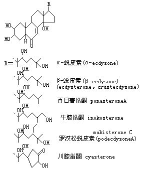 诱导昆虫、甲壳类等蜕皮、变态的激素。其主体物质是前胸腺激素(蜕皮激素、变态激素)。蜕皮激素是在蜕皮前的一定时间分泌的,它能促进皮肤上皮细胞的核酸、蛋白质合成,诱导有丝分裂,促进蜕皮的一系列反应。事前,有幼若激素作用时能引起幼虫期的幼虫蜕皮,而蜕皮素单独作用时,则使其向蛹或成虫变态引起蜕皮。最初是由A.Butenandt和P.Karlson从蚕蛹中分离出来的结晶体,因它具有蜕皮(ecdysis)作用,故名蜕皮(激)素。是C27的类固醇,从昆虫体可分离出α-蜕皮素、β-蜕皮素以及可能是其代谢产物的20,26-二氢蜕皮素。甲壳类亦含β-蜕皮素,曾一度被称为甲壳蜕皮素(Crustecd- ysone)。前胸腺是受脑激素的支配,以胆固醇为原料,生成并分泌α-蜕皮素。它可在昆虫绛色细胞(oenoc- yte)等氧化成β-蜕皮素。β-蜕皮素的活性远比α-蜕皮素高。蜕皮素在靶细胞中能促进DNA、RNA、蛋白质等的合成和细胞分裂。其结果,作用于幼虫真皮细胞,由表皮分离(apolysis)到新表应形成的一系列过程(蜕皮)。蜕皮素可提高蝇类的老熟幼虫皮肤中酚氧化酶(phenol oxidase)和多巴脱羧酶(dopa de- carboxylase)的活性,诱导促进围蛹壳形成的反应系统。对成虫原基也同样能促进其核酸、蛋白质的合成,而导致蛹和成虫的分化。关于蜕皮素在靶细胞中的作用方式,有的学说认为是进入核中在基因的水平上参与调节;另种学说认为是作用于核膜或其它膜对其透性产生影响。虽然是直接的抑或是间接的还不清楚,但作用于基因是肯定的。根据果蝇和摇蚊蛹化时唾液腺染色体出现特定的疏松部;以及给以蜕皮素则可促进其迅速发生和蝇的围蛹壳形成时能合成酶蛋白等一些事实,有人认为蜕皮素的作用在于诱导特定的mRNA合成,但详细过程并不清楚。此外,从植物体中也发现多种有昆虫蜕皮素活性的所谓植物蜕皮素(ph- ytoecdysone)。其中也含有α-蜕皮素、β-蜕皮素,还含有昆虫体所没有的百日青甾酮(ponasterone)和川甾酮(cyasterone)等,它比昆虫的蜕皮素活性高。它们都是含2,3,14-羟-7-烯-6-酮结构的类固醇。