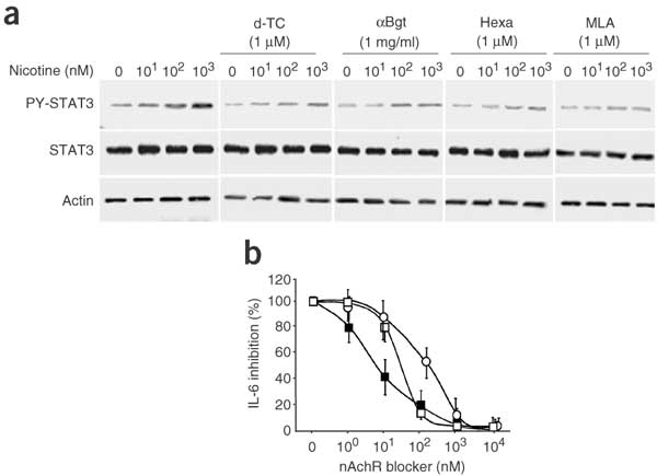 (STAT3 phosphorylation by nicotine is prevented by 7-selective nAChR antagonists.)