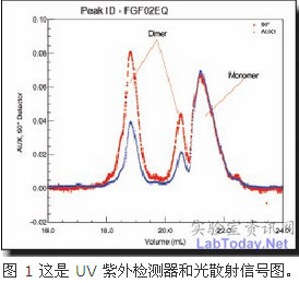 图 1是轻度氧化的基本纤维原细胞增长因子(bFGF)(由0.2当量的DTNB制成)的色谱图。前两个峰的光散射信号大约是UV信号的两倍,而第三个峰两者的信号强度相等。从图上很清楚地看出,从左到右三个峰,其中两个是两种二聚体,一个是单体bFGF,它们的分子量分别是33K,34K,17K道尔顿。