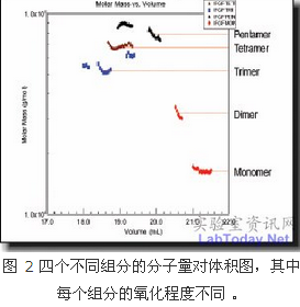 图 2是四个不同组分的分子量对洗脱体积图,每一组分都有不同程度的氧化。很明显,存在着二聚体、三聚体、四聚体,但出现的顺序和洗脱体积的顺序不一致。